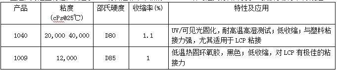 正是因為這些特性,決定了LCP材料是非常難粘的。AVENTK針對這類(lèi)材料開(kāi)發(fā)了2款UV膠水,分別是1040和1009,其物性參數如下: