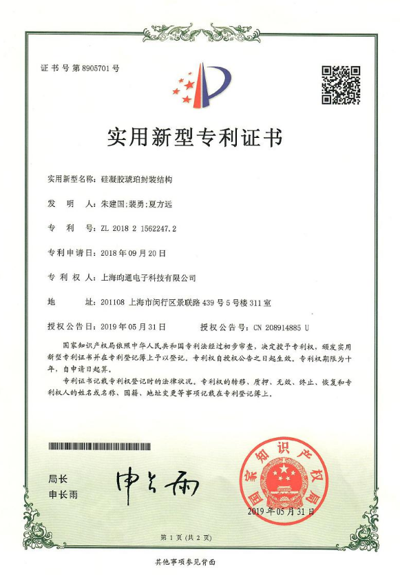 硅凝膠琥珀封裝結構實(shí)用新型專(zhuān)利證書(shū)